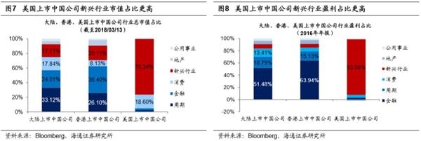 美国上市的中国公司业绩更强源于新兴行业占比更高。将所有公司分为新兴行业(信息技术+医疗保健)、消费(非日常生活消费品+日常消费品)、周期(工业+能源+原材料+电信业务)、金融、地产、公用事业六类,大陆、香港、美国上市的中国公司里面新兴行业市值占比分别为17.71%、20.11%、76.34%,盈利占比分别为6.94%、6.12%、93.58%。在大陆上市的中国公司2017年三季报净利润增速(整体法)19.81%,其中新兴行业净利润增速(整体法)26.85%,在香港上市中国公司2017年中报净利润增速(整体法)20.39%,其中新兴行业净利润增速(整体法)27.83%,在美国上市中国公司2016年年报净利润增速(整体法)25.95%,其中新兴行业净利润增速(整体法)27.59%。整体上新兴行业盈利增速都明显更快,在美国上市中国公司由于新兴行业占比更高,带动整体业绩强劲增长。从股价上涨的行业结构看,2016年1月27日以来在大陆上市中国公司市值加权平均涨幅61%,其中新兴行业市值加权平均涨幅82%,在香港上市中国公司市值加权平均涨幅130%,其中新兴行业市值加权平均涨幅156%,在美国上市中国公司市值加权平均涨幅164%,其中新兴行业市值加权平均涨幅178%。陆港美三地新兴行业涨幅都明显超过整体,新兴行业带动整体上涨。美国上市中国公司的走强正反映了中国经济正在转型,不过转型的企业更多不是在A股上市,而在海外上市。