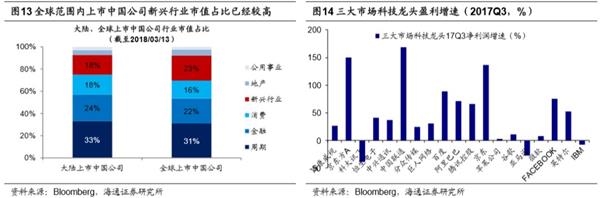 上市制度改革将使得A股科技股占比提高,未来A股指数代表性将更强。我国目前发行制度背景下,很多新兴成长行业的领军企业无法在 A 股上市。目前,中国大陆市值最大的4家上市科技公司:以人民币计价,腾讯控股2.3万亿,阿里巴巴2.2万亿,百度0.5万亿,京东0.3万亿,其中阿里巴巴、百度、京东在美国上市,腾讯在香港上市。严苛的财务标准导致了A股结构扭曲。随着注册制改革的稳步推进,国家对于新技术、新产业、新业态、新模式的支持力度不断加大。360回归A股、富士康IPO“特批”进入“绿色通道”,36天过审的“神速”展现了监管层面对于发行制度改革创新的重视。中国资本市场正在为“独角兽”企业敞开大门。政策的倾斜将引导科技股新鲜血液的流入和回归。可以预见的是,科技类行业IPO数量和市值占比将在A股市场逐渐升高,对应的周期类行业占比将会减小,随着更多高成长的“独角兽”在A股上市,A股市场结构将趋向合理,为迈向新的高点打下坚实的基础。股市作为经济的晴雨表,在中国宏观经济保持平稳向上的态势下,A股指数为何不如MSCI中国(除A股)等海外指数呢?原因在于许多中国市值大、盈利好的公司在香港或美国上市,中国A股并没有全面代表中国实体经济,尤其是新经济的代表性不强。近两年部分新兴产业中概股盈利高增长,且累计涨幅较大,正处于盈利高速增长阶段。以BATJ为例,从盈利的角度看,2017Q3百度的净利润、营收同比增速分别为88%、17%,阿里巴巴为71%、57%,腾讯控股为 66%、59%,京东为136%、41%。从涨跌幅的角度看,2016年1月底以来百度、阿里巴巴、腾讯、京东累计涨幅分别为54%、168%、214%、68%。未来类似BATJ的公司在A股上市,或者海外上市的类似企业选择回归A股,A股的成份将会发生很大变化。
